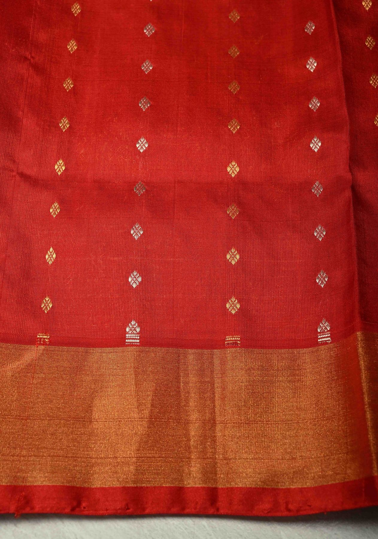 The body is dotted with exquisite Sona Rupa (Gold and Silver Zari) Buttas, adding a classic, rich metallic sparkle. The saree is finished with a striking Zari Border, lending structure and traditional grandeur. This piece is perfect for graceful daytime events or sophisticated celebratory wear