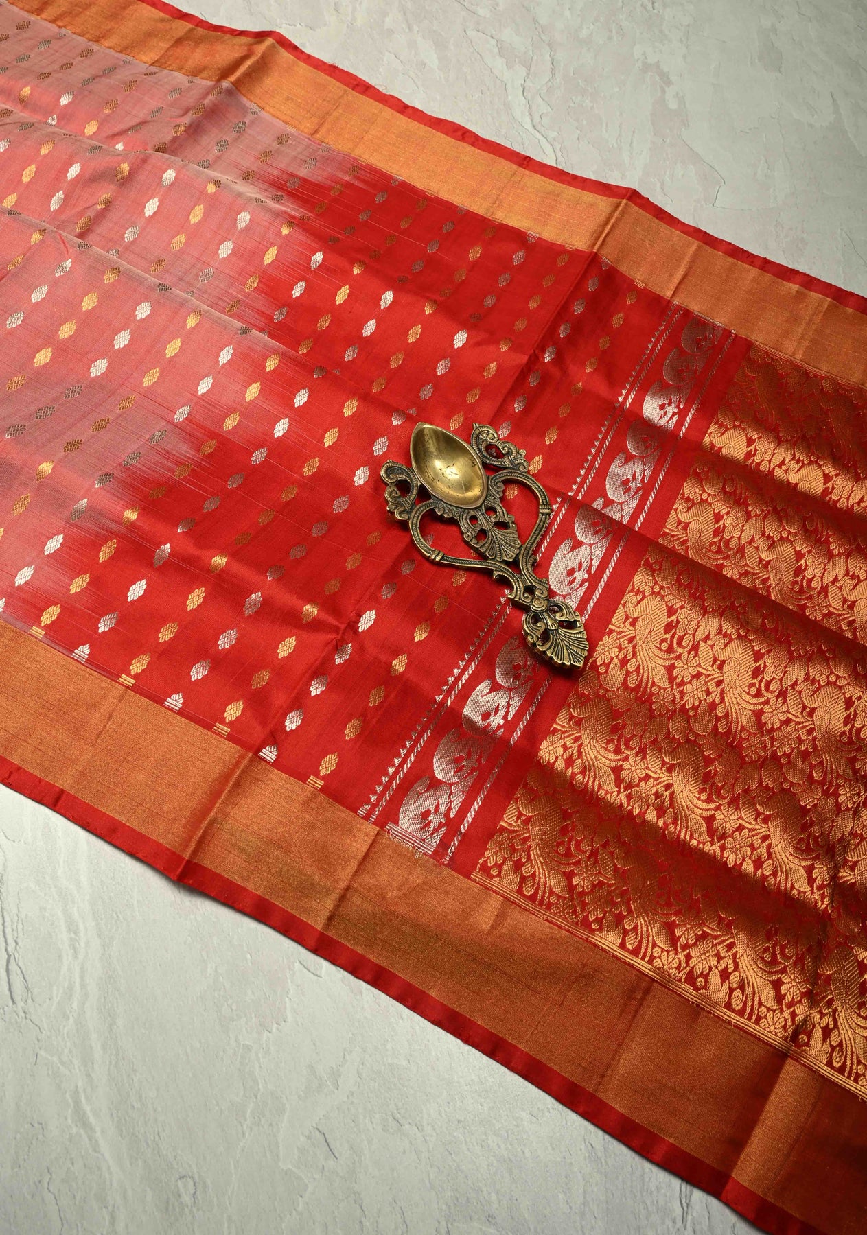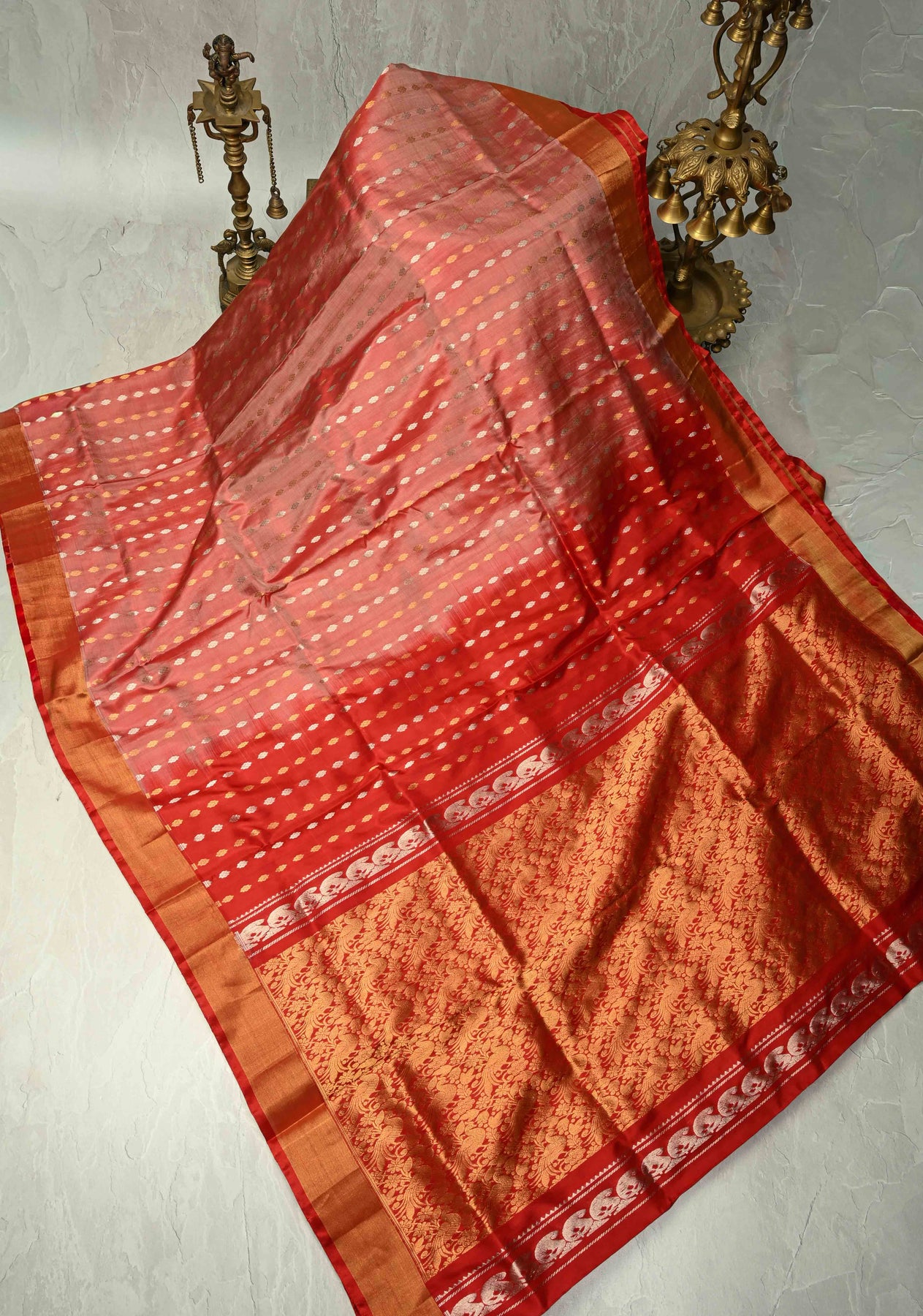 Indulge in the delicate charm of this Light Carmine Pink Dual Tone Uppada Pure Silk Saree. The dual-tone weave allows the fabric to shift elegantly between soft pink and subtle coral hues, creating a beautiful iridescence characteristic of fine Uppada silk.