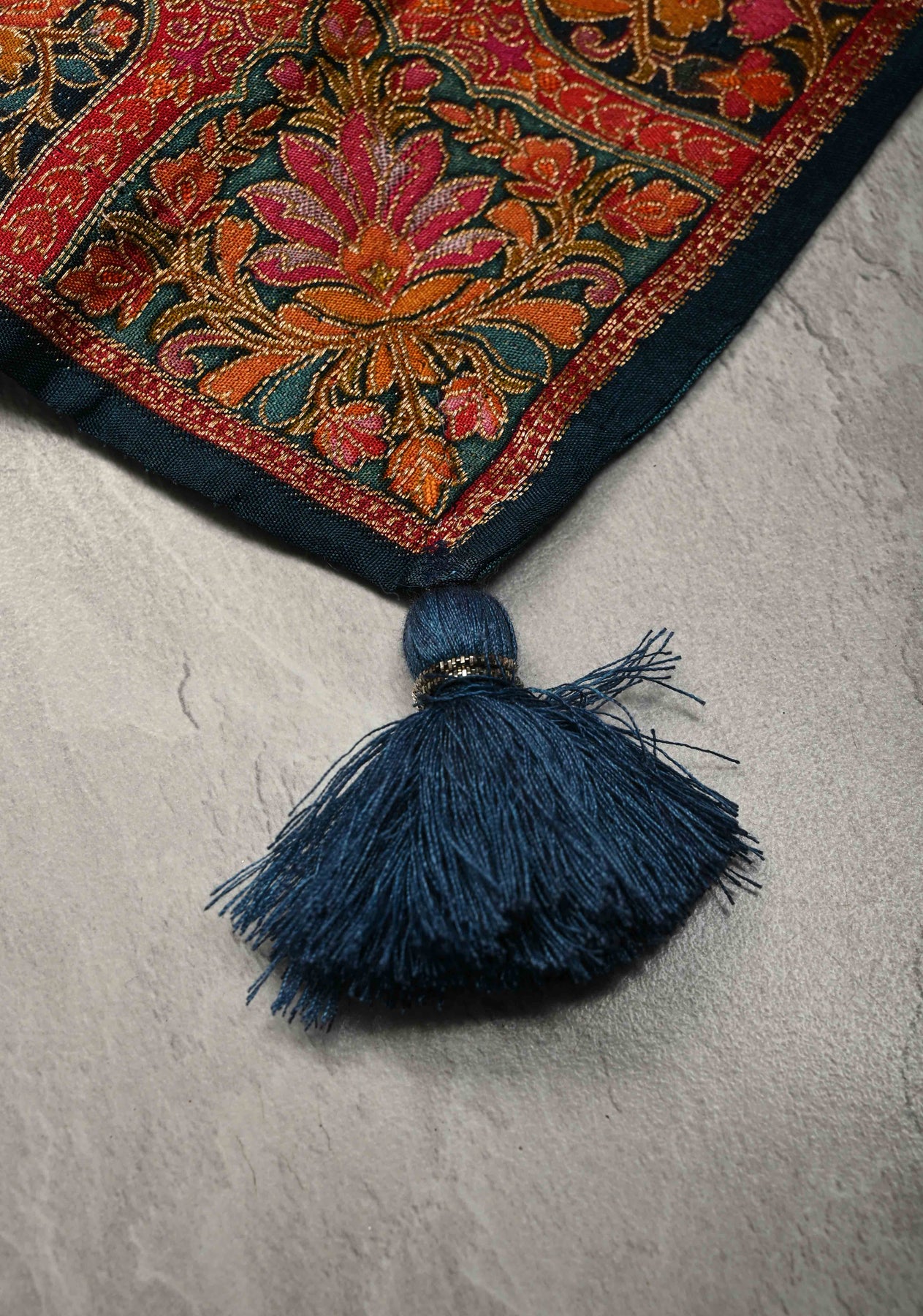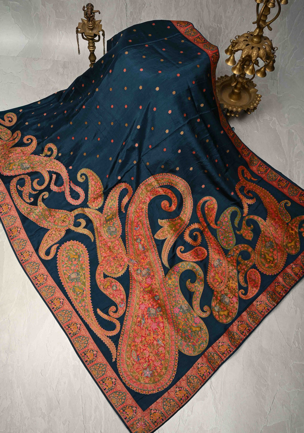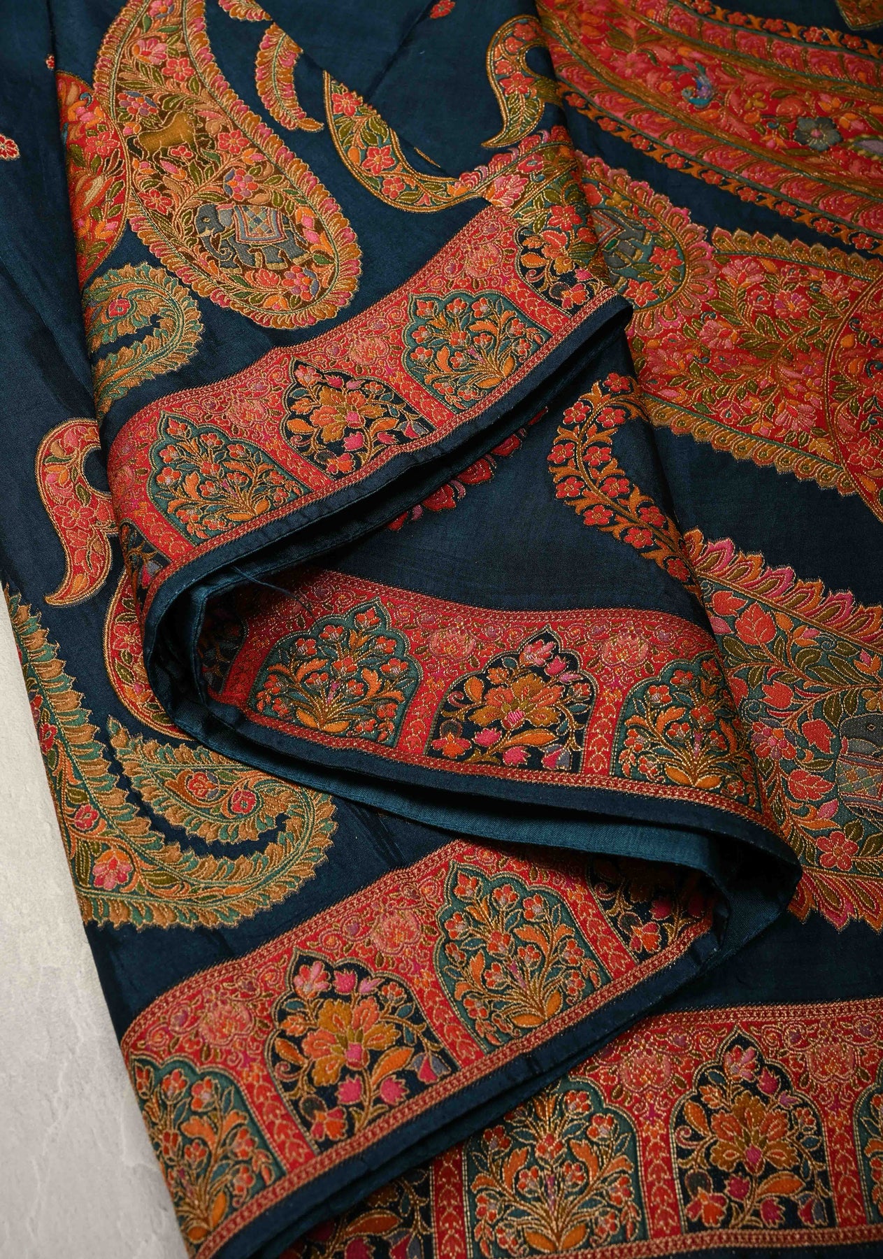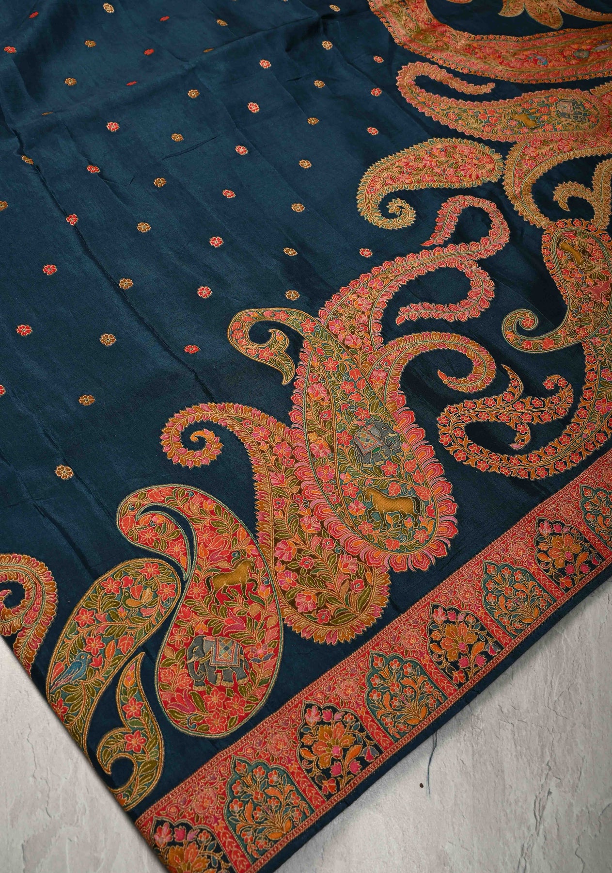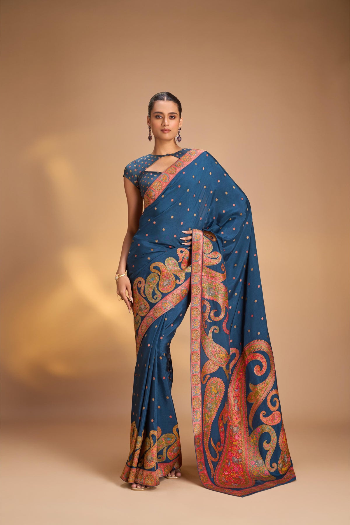 Elegant and timeless, this Persian Blue Vegan Viscose Silk Saree is a masterpiece of traditional craftsmanship and sustainable fashion. Woven from vegan viscose silk, the saree features an exquisite Kashmiri Kani weave design, known for its intricate patterns and heritage appeal. The coordinated Kani-style border adds richness and depth, enhancing the saree's regal charm. Ideal for festive occasions, weddings, or cultural events, this saree is a perfect blend of grace, tradition, and conscious styling.