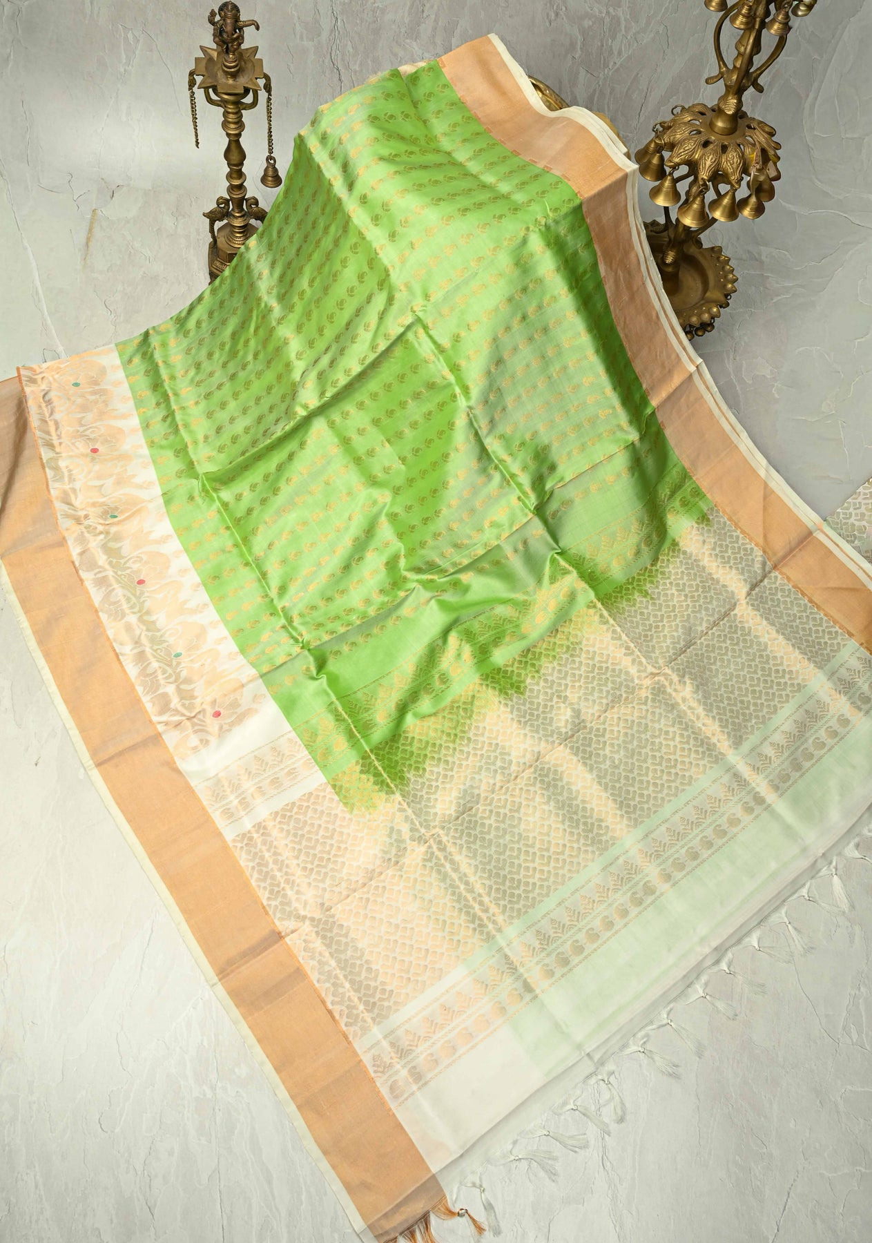 Pista Green Uppada Handloom Silk Saree with Zari Buttas and Meenakari Pannel on Tissue Border | SILK MARK CERTIFIED