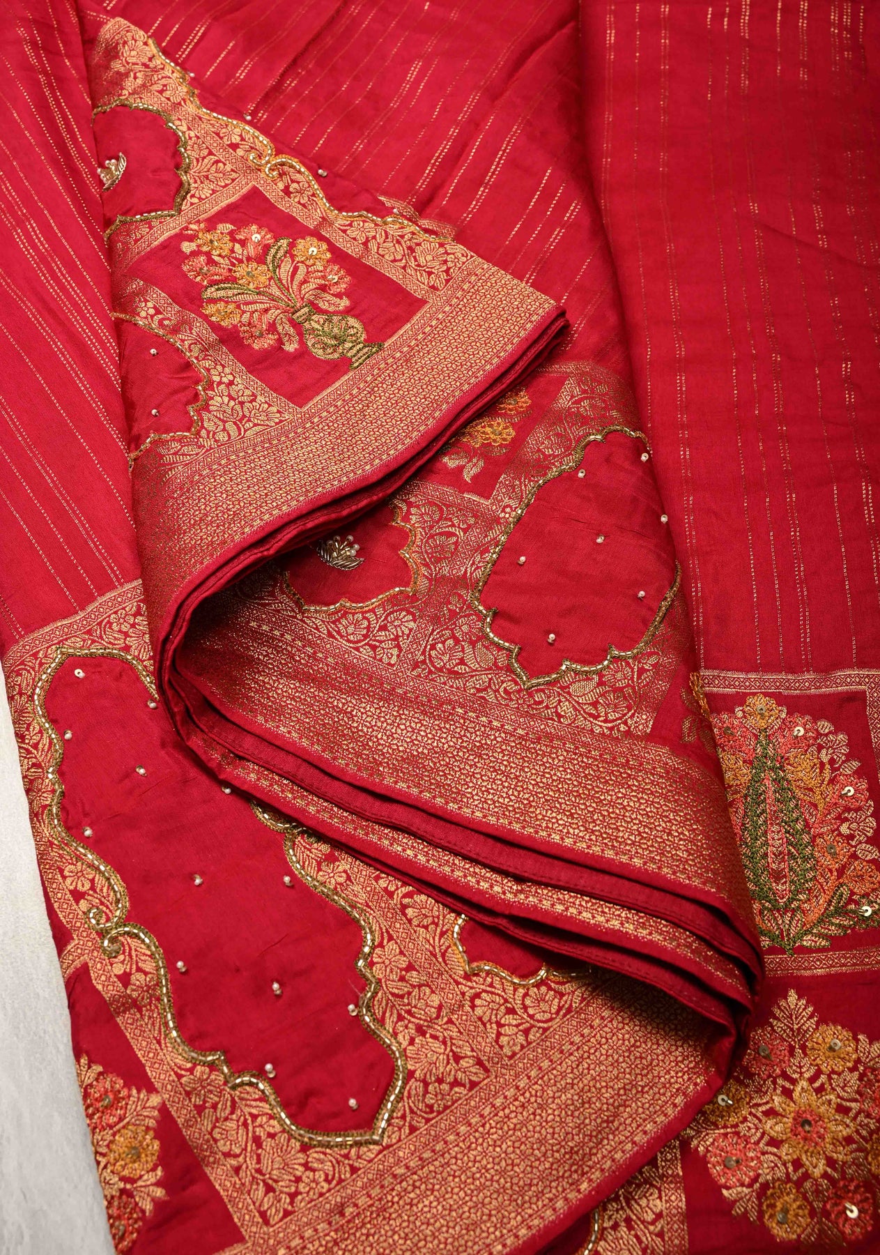 This saree is ready to wear with fall and pico done. An unstitched blouse fabric is included.