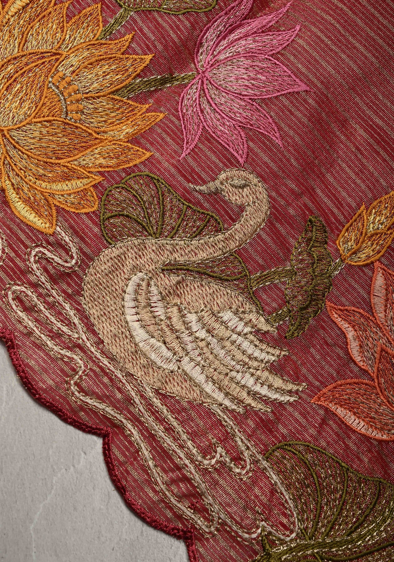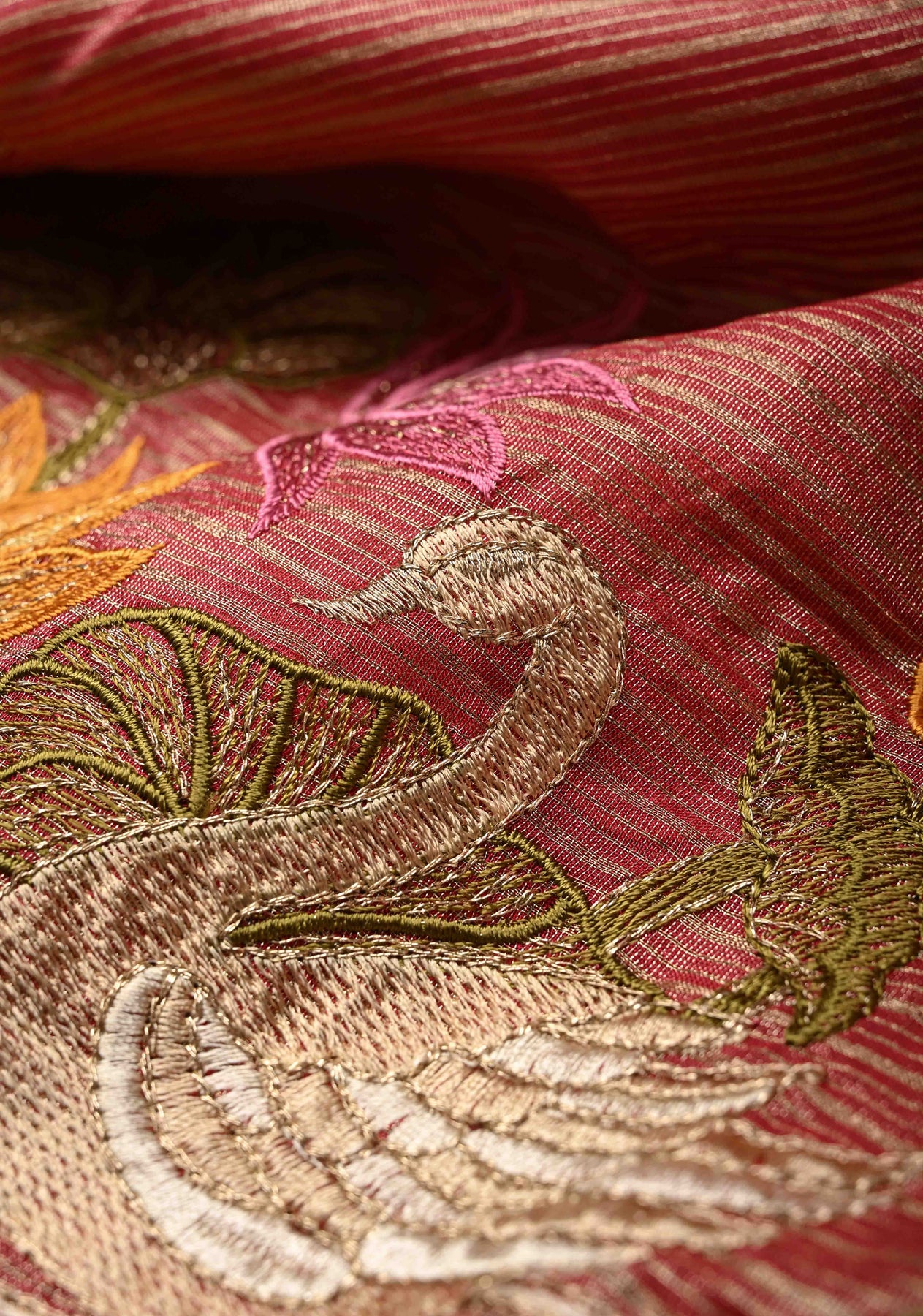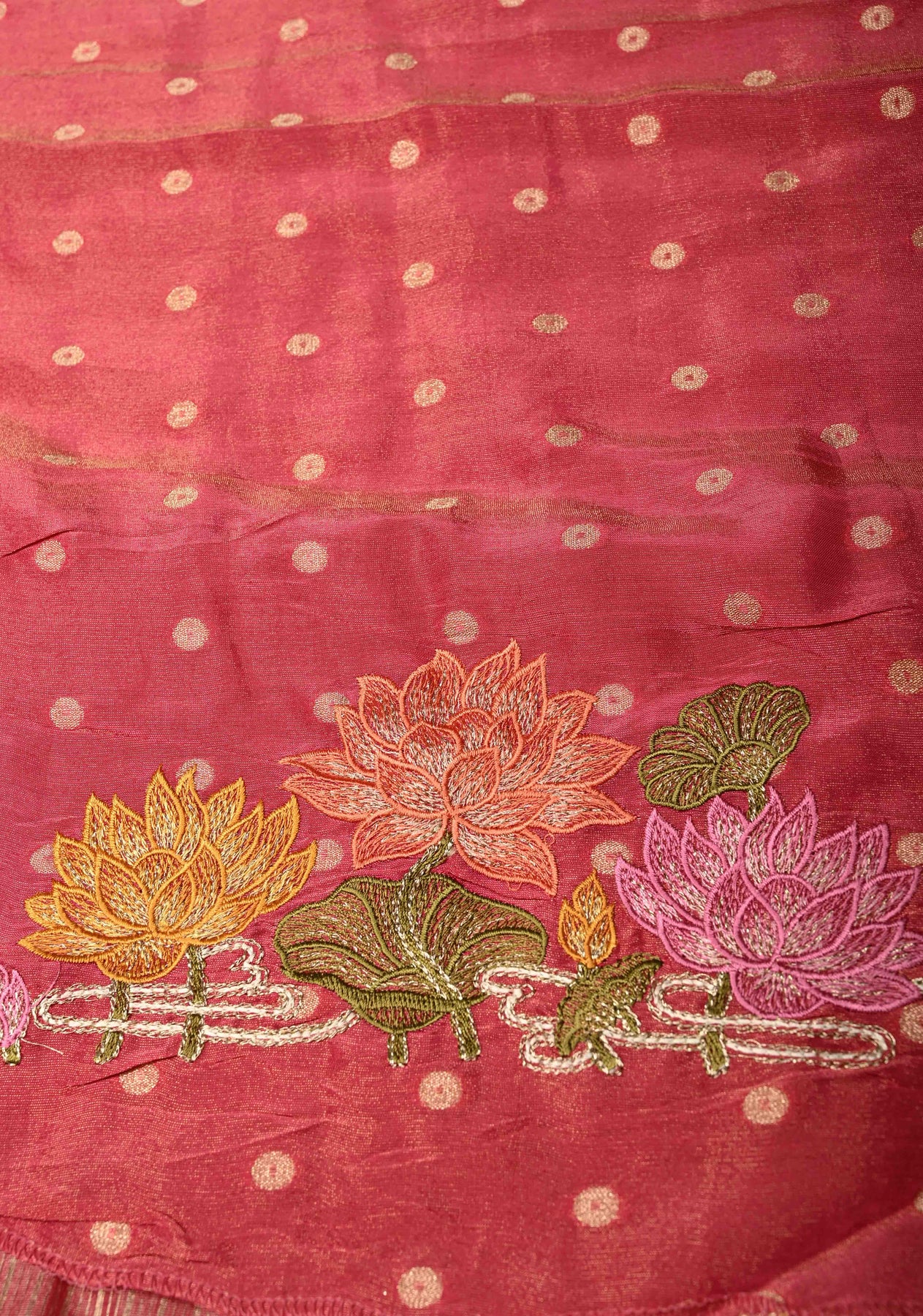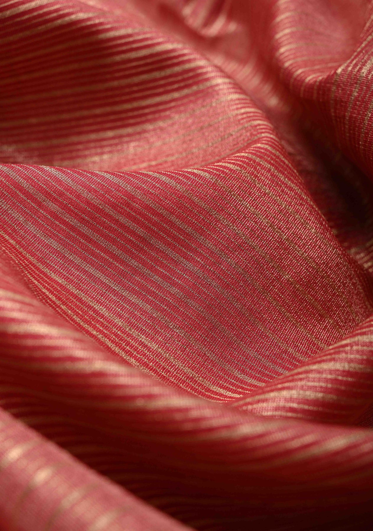 This Rose Pink Vegan Viscose Tissue Stripes Saree exudes timeless elegance with a modern, eco-conscious twist. Crafted from soft and breathable vegan viscose tissue, the saree features subtle stripe detailing that adds depth and a gentle shimmer to the fabric. The true highlight lies in its intricately embroidered scallop border, showcasing delicate lotus and swan motifs that symbolize purity and grace. Lightweight and luxurious, it's a perfect choice for festive occasions, intimate gatherings, or wedding celebrations.