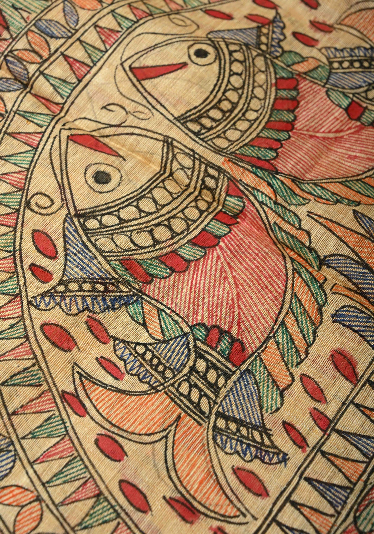 The Peach Vegan Silk Dupatta with Madhubani Hand Painting beautifully combines cruelty-free luxury with rich traditional artistry. Crafted from soft, eco-friendly vegan silk, it offers a lightweight, elegant drape enhanced by its soothing peach hue. The dupatta is adorned with intricate Madhubani motifs, meticulously hand-painted by skilled artisans, adding cultural depth and vibrant detailing to the piece. Perfect for pairing with ethnic suits, kurtas, or festive ensembles, this dupatta brings a refined, handcrafted charm to any outfit while promoting sustainable fashion.