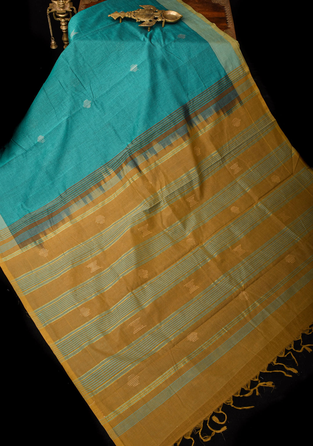 The yarn of the aloe and kenaf saree is derived from plant waste of Aloe Vera and blended with Kenaf Cotton (which needs less water than the Conventional Cotton plant) and Handwoven into a saree.
