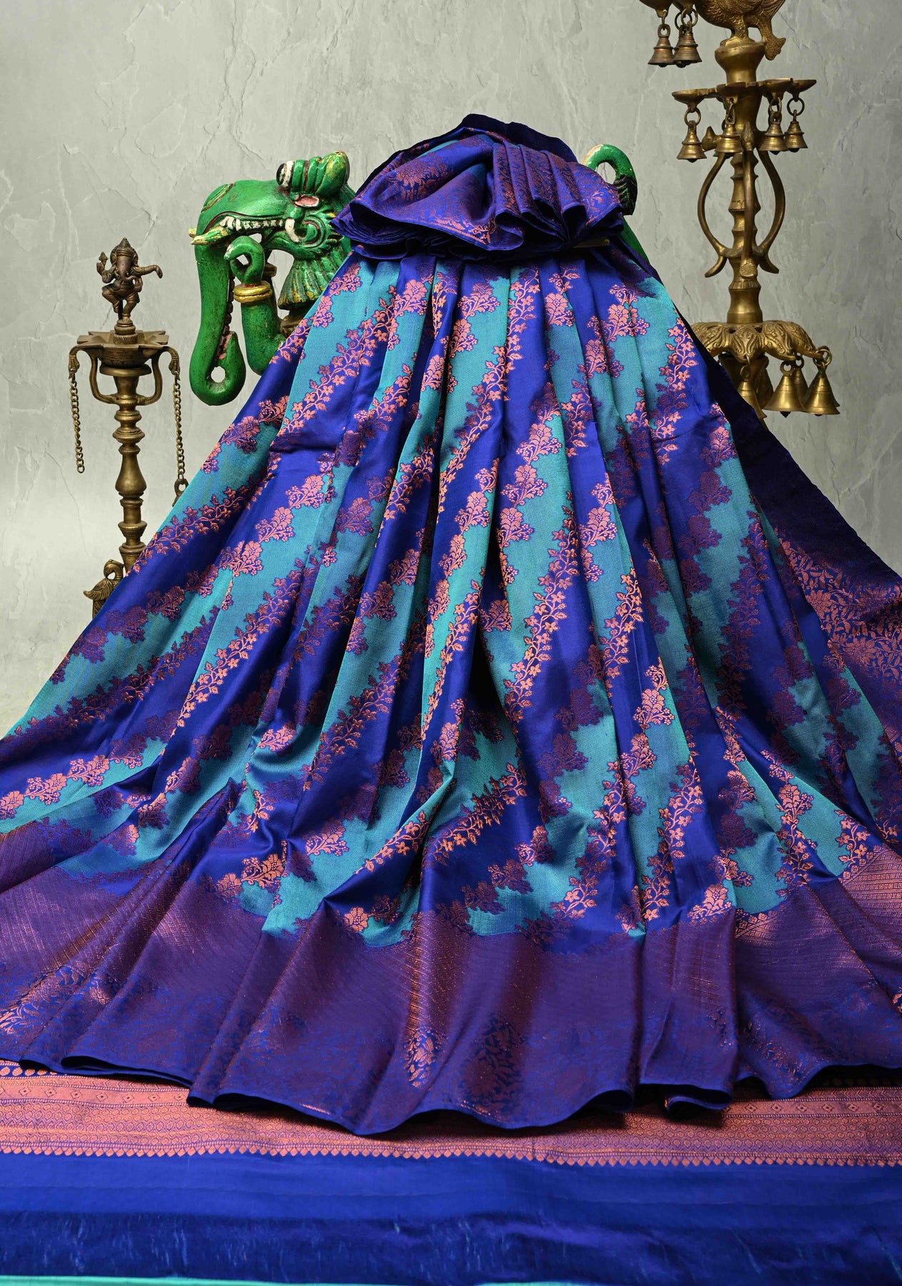 This beautiful Blue-Turquoise Pure Kanchi Silk Saree combines the elegance of traditional design with the precision of modern weaving. Crafted on a powerloom, it retains the classic Rangkaat style pattern while offering a more accessible and consistent finish. The saree features a blue-turquoise shade and is enhanced with a striking copper zari border, giving it a regal and festive appeal. Lightweight yet luxurious, it is perfect for weddings, cultural events, and special occasions, offering the charm of Kanchi silk with contemporary craftsmanship.