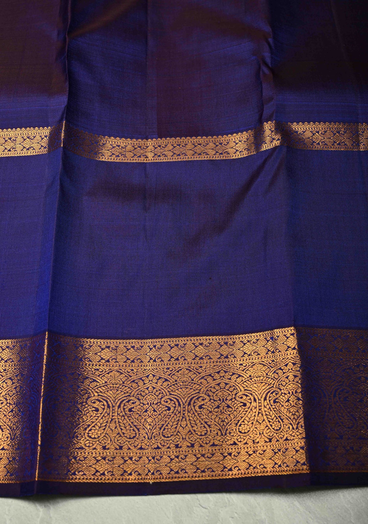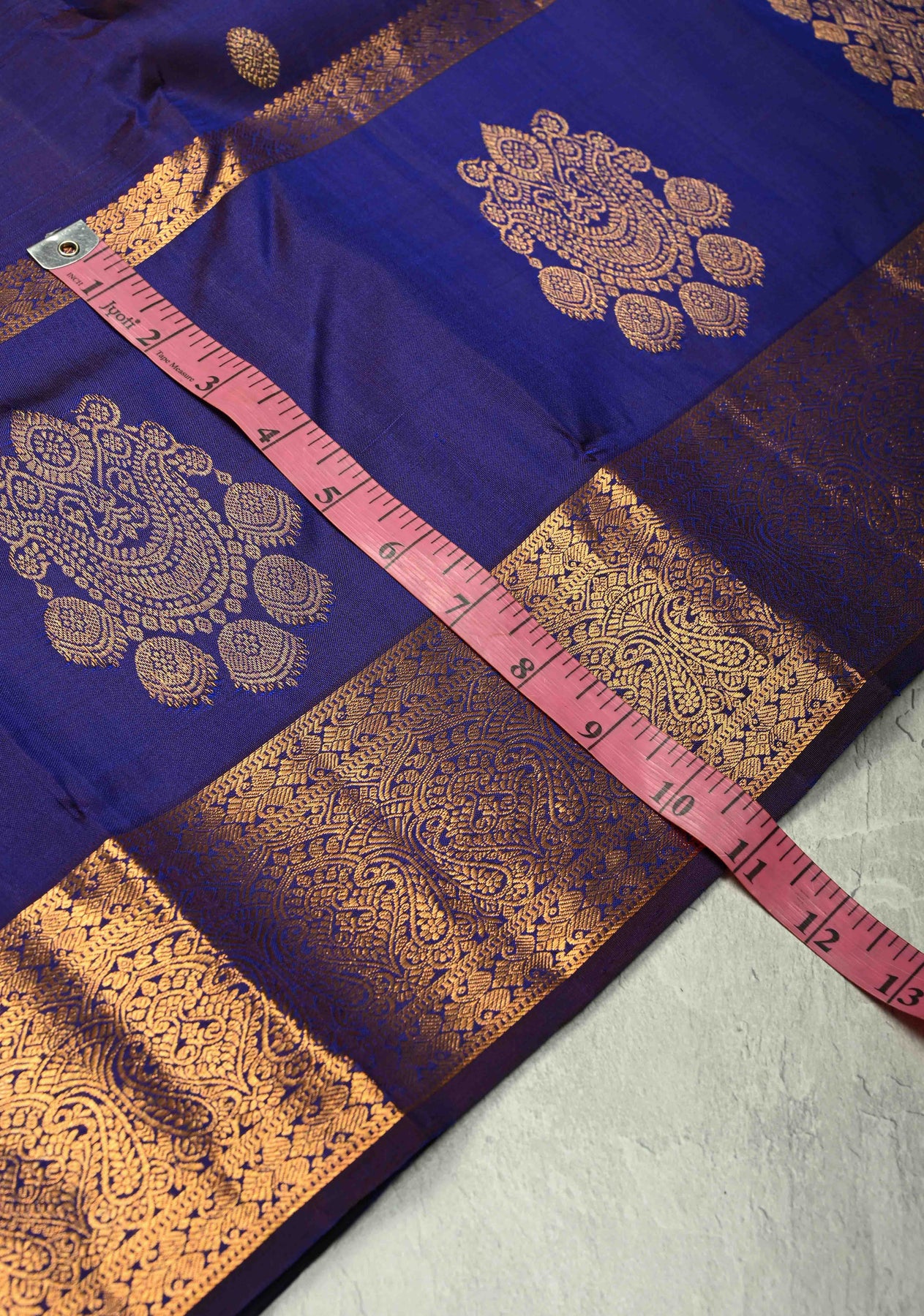 Exude Ink elegance with this Royal Blue Kanjivaram Pure Silk Saree, a perfect blend of tradition and . Handwoven from authentic Kanchipuram silk, it features delicate zari buttas across the body and intricate damask motifs on the zari border, adding sophistication and grandeur. Ideal for weddings, festive occasions, and cultural celebrations, this saree is a timeless piece that highlights heritage craftsmanship with a regal appeal.