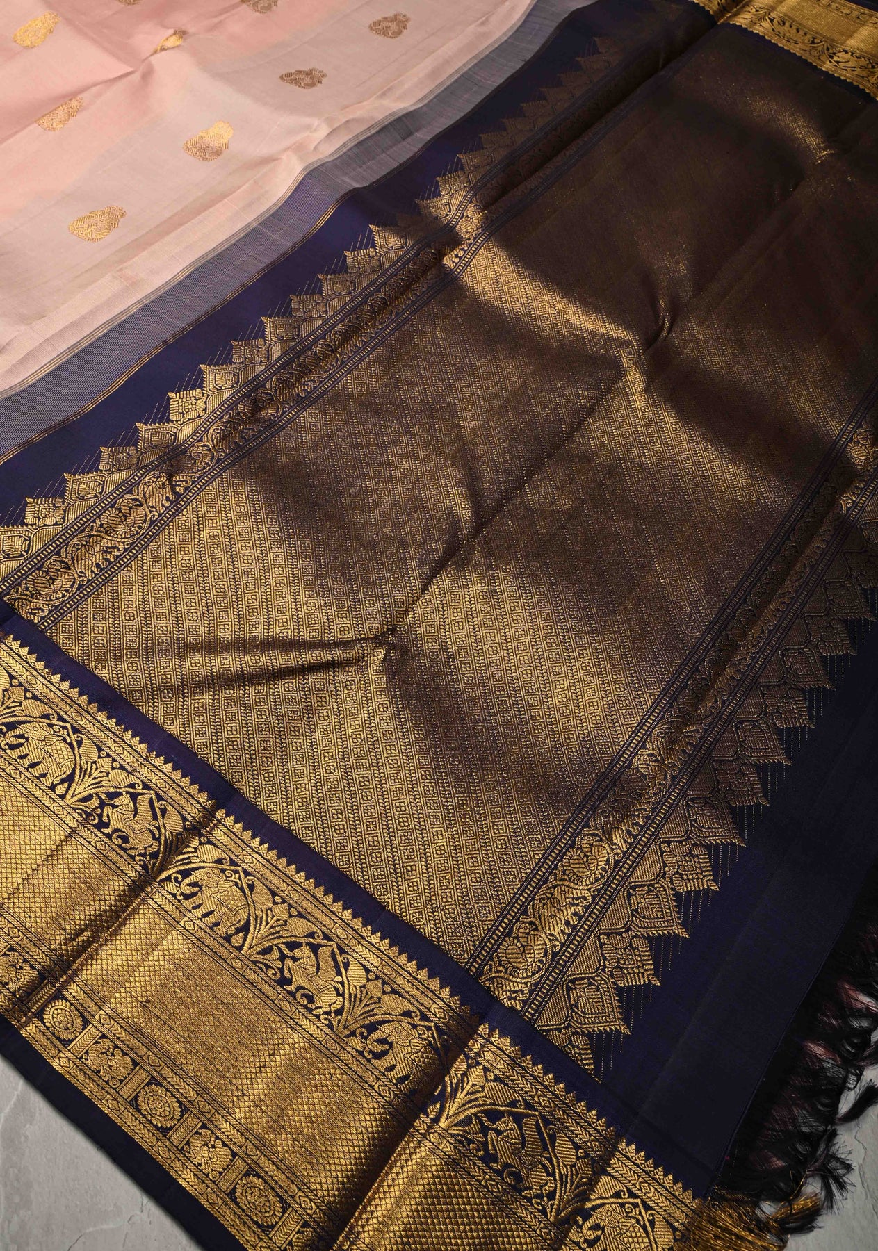 This Light Dusty Rose Korvai Kanjivaram Pure Silk Saree radiates delicate charm and timeless elegance. The Light Dusty Rose silk body is adorned with intricate zari buttas, adding a graceful shimmer and enhancing the saree’s refined beauty. Complemented by a striking contrast zari border, woven in the traditional Korvai style, it offers a perfect balance of subtlety and richness. Crafted from pure silk, this saree drapes smoothly, making it an ideal choice for weddings, festive occasions, and cultural celebrations where understated sophistication is key.