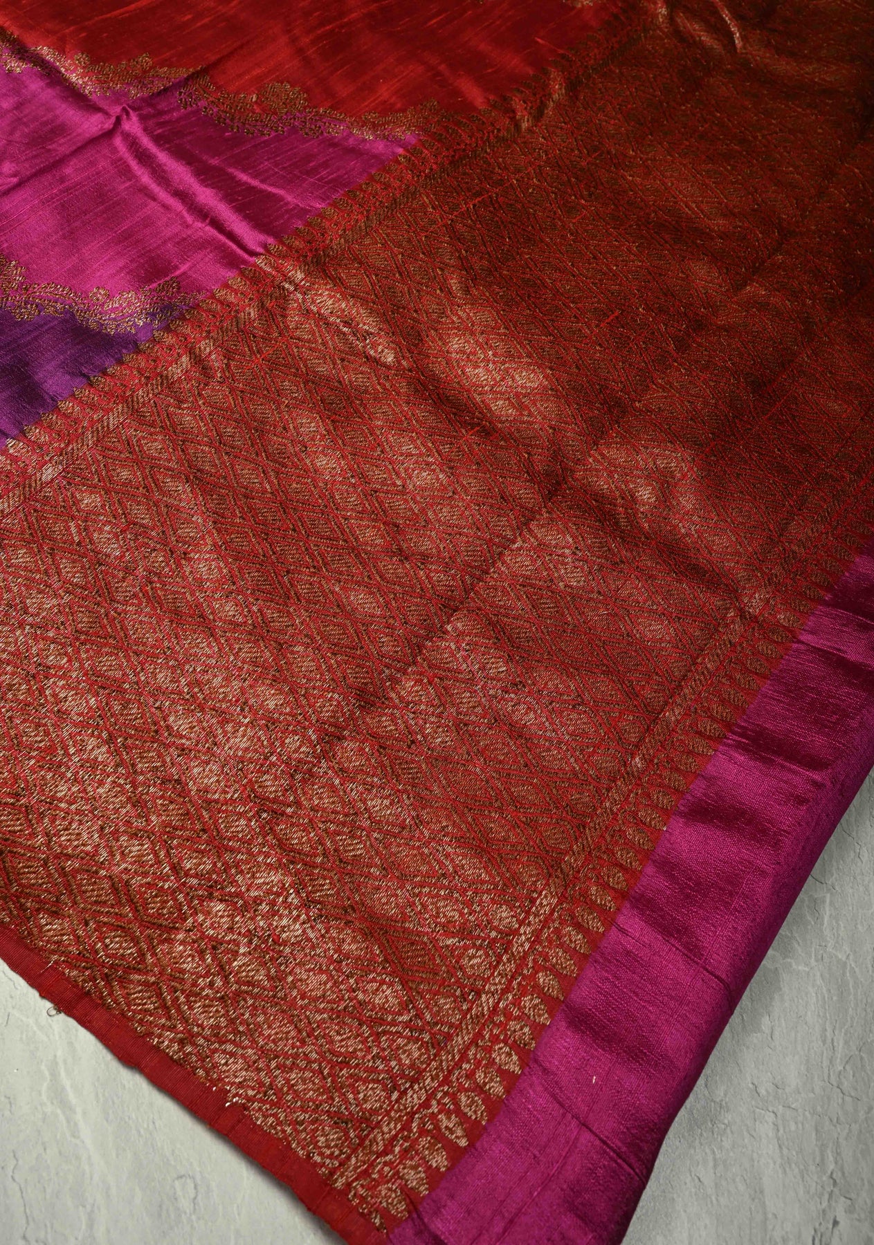 This luxurious Multicolor Borderless Raw Silk Banarasi Brush Dye Saree is a breathtaking fusion of rich hues and traditional craftsmanship. Woven from raw silk, it showcases a stunning interplay of deep pink, deep purple, and red shades, achieved through a meticulous brush dye technique that lends a painterly charm to the fabric. The saree features the intricate Rangkaat weaving style, a signature of Banarasi artistry, and is beautifully detailed with antique zari diagonal stripes that add a regal shimmer. With its elegant borderless design and lustrous texture, this saree is a perfect choice for festive occasions, weddings, and grand celebrations, exuding timeless sophistication and vibrant elegance.