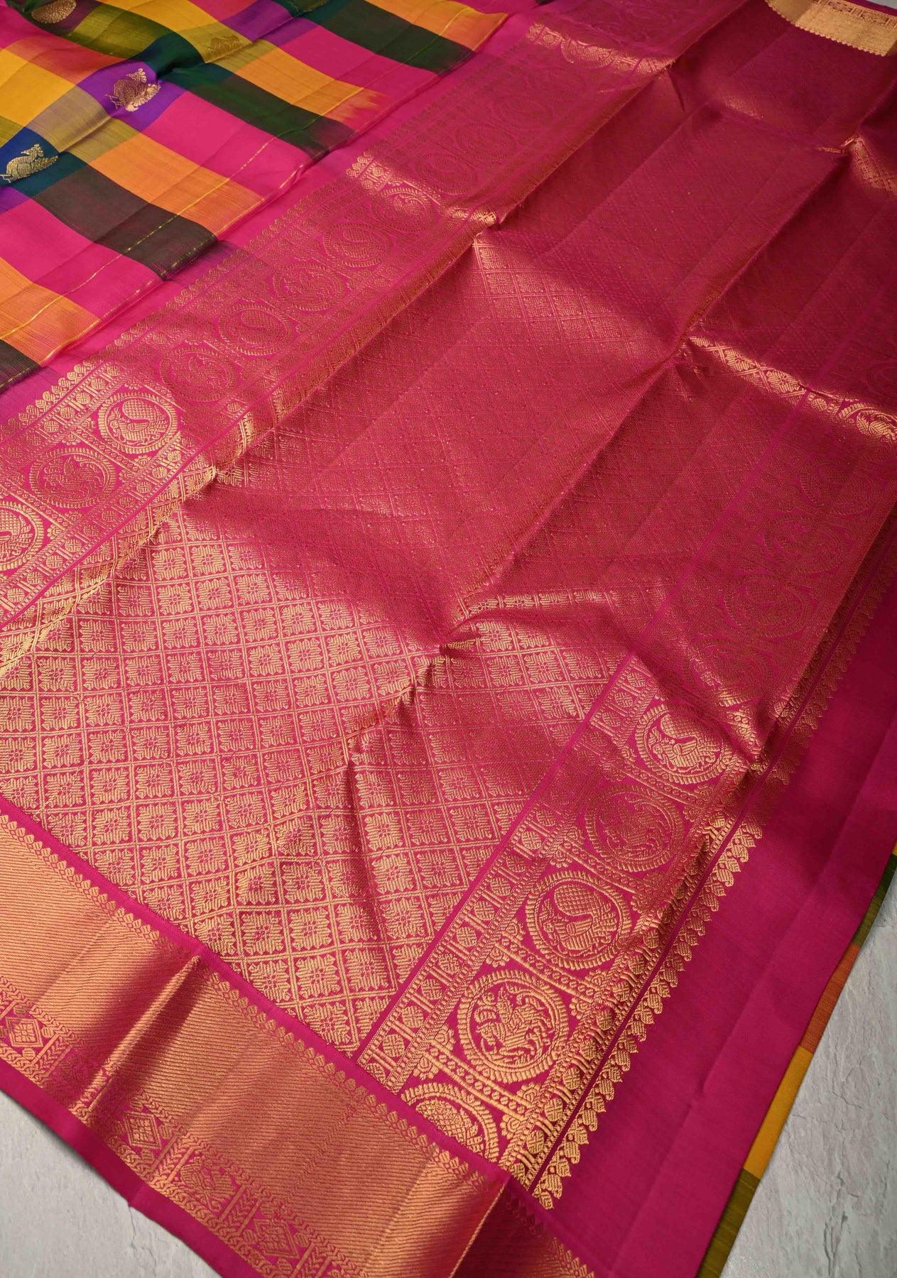 The Multicolor Pallum Pazhamum Kanjivaram Silk Saree is a vibrant celebration of traditional South Indian artistry and cultural heritage. Woven from pure Kanjivaram silk, this saree features the iconic Pallum Pazhamum motif, symbolizing prosperity and auspiciousness, rendered in multicolored hues. Delicate zari buttas are intricately woven across the body, adding a graceful shimmer, while the classic zari border frames the saree with timeless elegance. Perfect for weddings, festive occasions, and traditional ceremonies, this saree is a true heirloom piece.