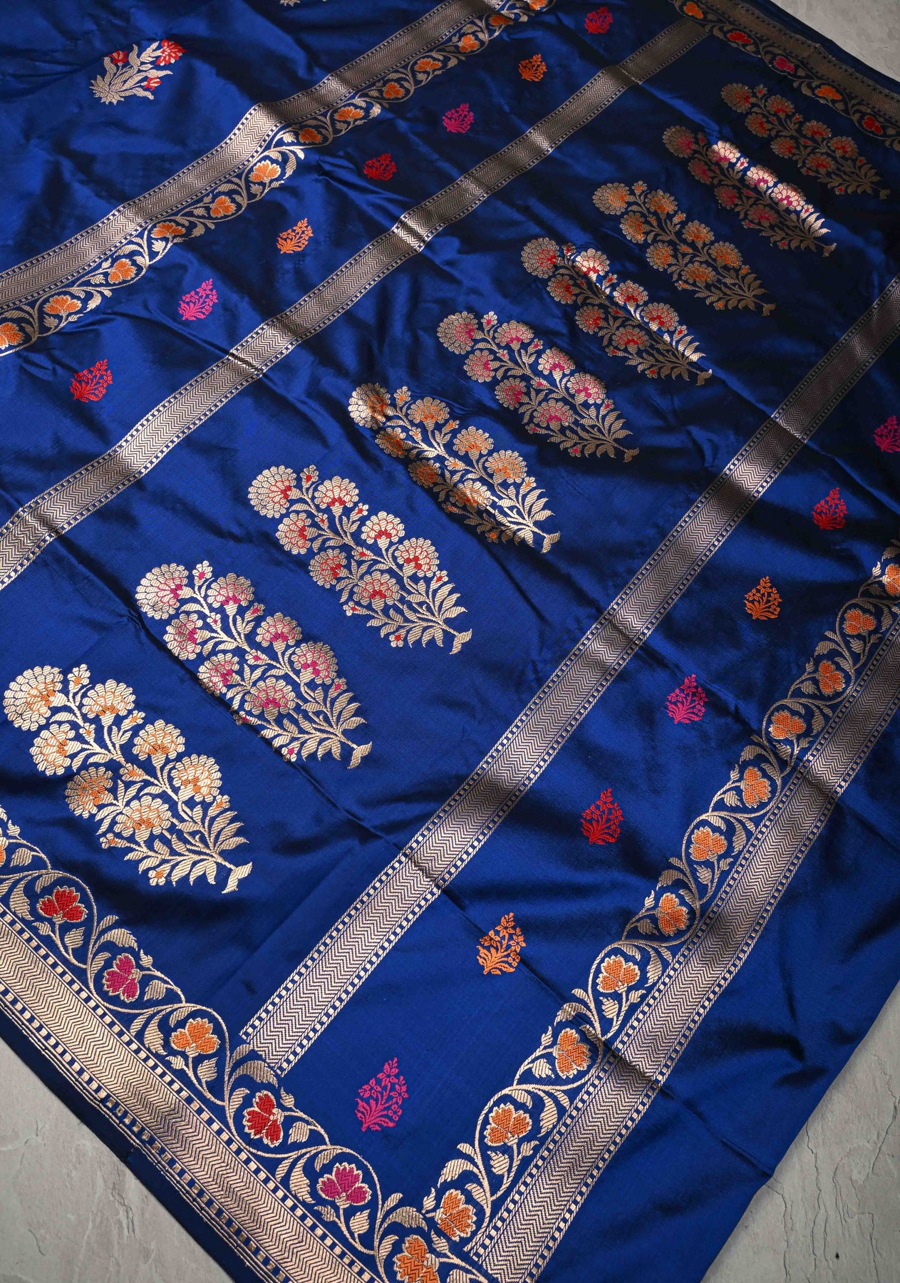 The deep royal blue body is adorned with exquisite floral meenakari zari buttas, delicately crafted to shimmer with colorful enamel and golden zari work, adding a rich, artistic dimension to the fabric. The saree’s striking meenakari border and pallu further enhance its regal appeal, featuring intricate floral motifs that beautifully complement the body design.