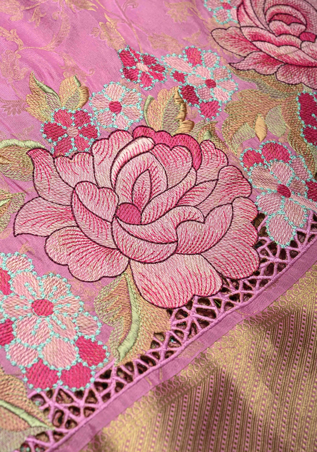 KSIC Grade Thickness Thistle Floral jaal on Mysore Silk Saree with Machine Embroidery and Cutwork | SILK MARK CERTIFIED