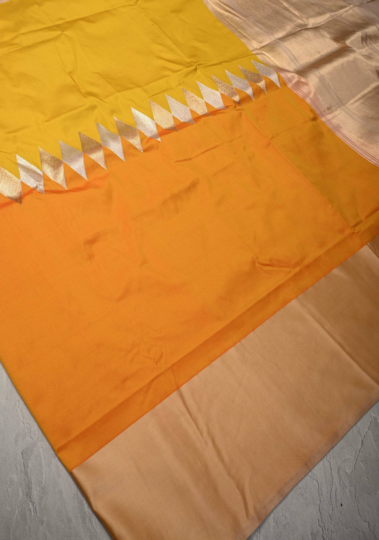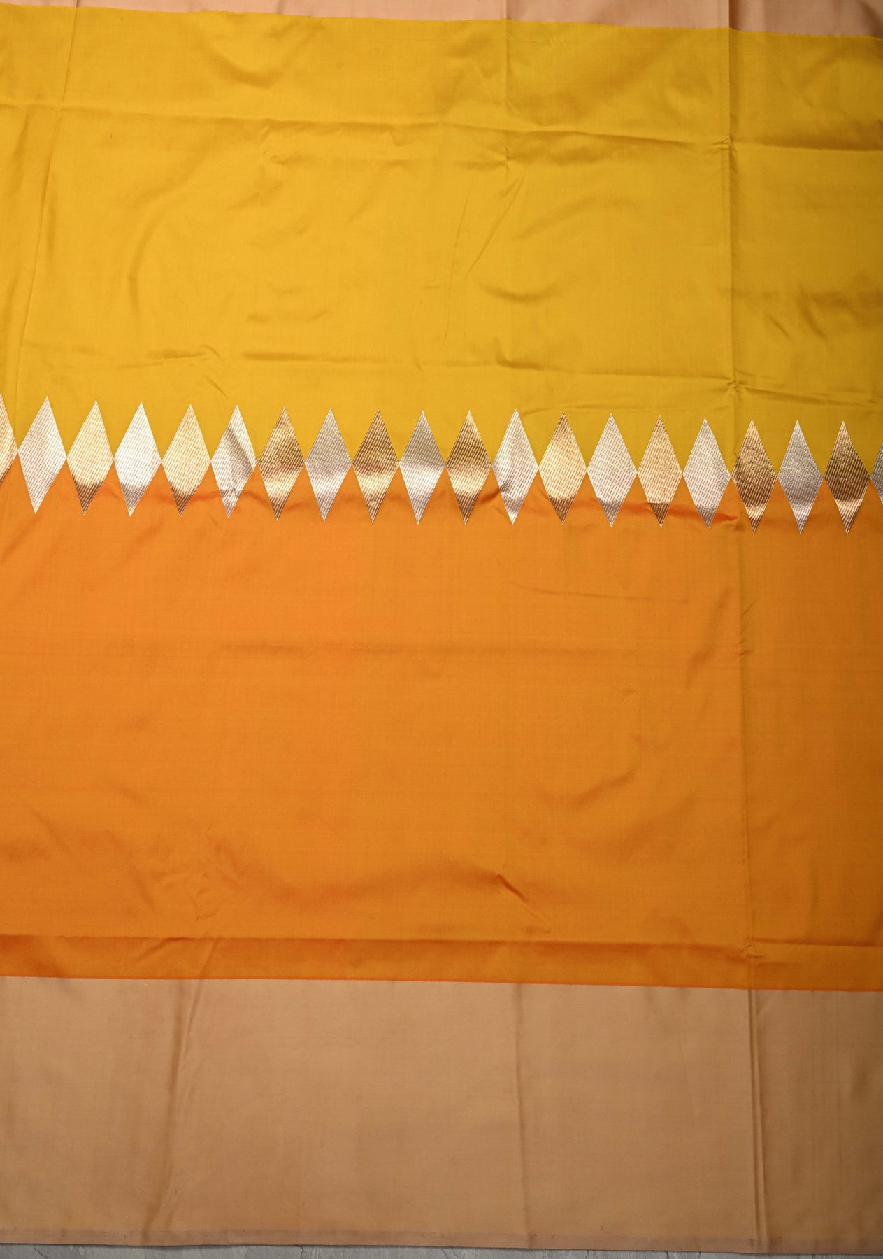 The vibrant yellow ochre hue adds warmth and sophistication, making it perfect for festive occasions, weddings, or grand celebrations. The intricately woven geometric patterns in metallic threads reflect the timeless beauty of Banarasi weaving, while the contrast satin border adds a bold finish, framing the saree with subtle opulence.