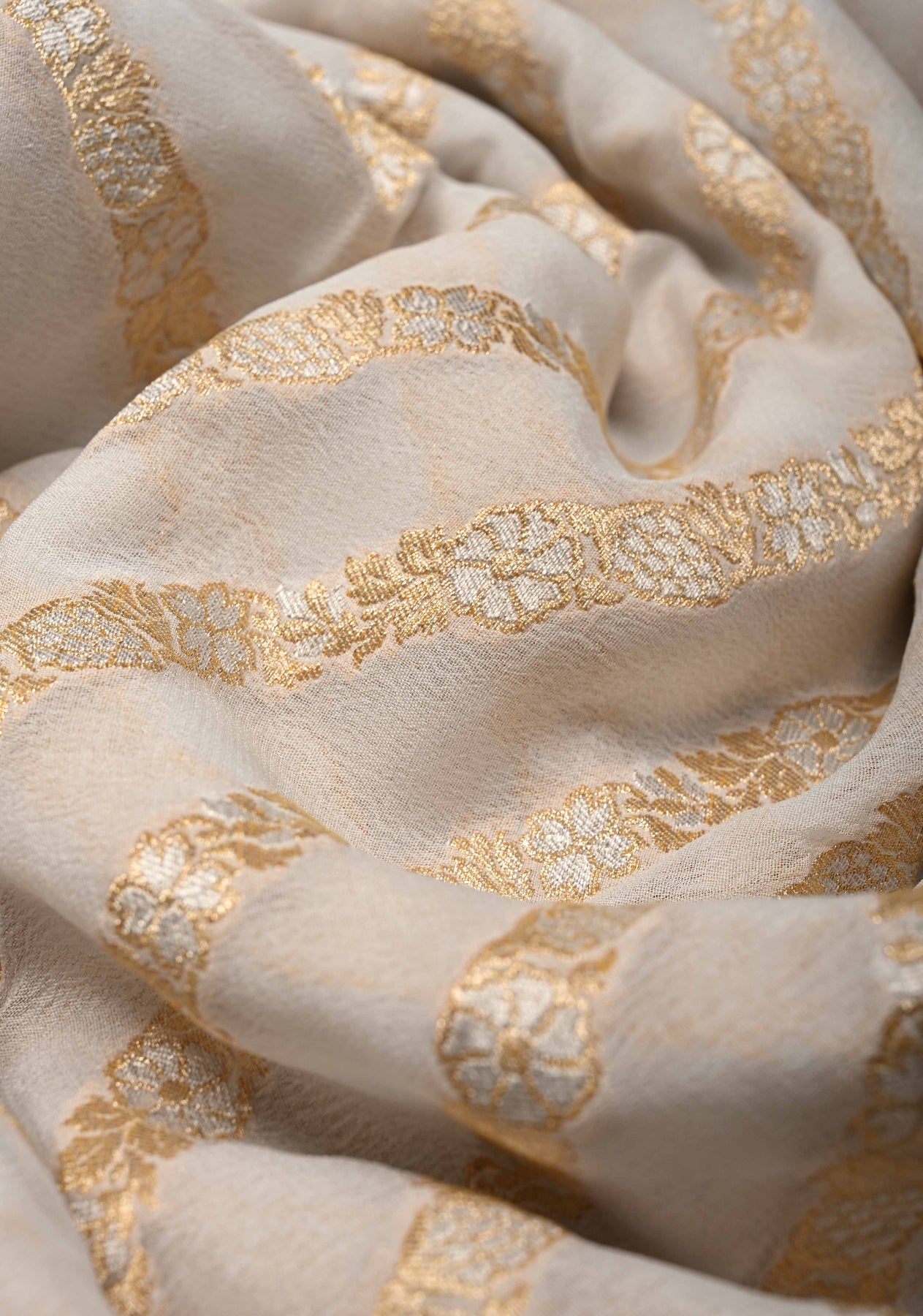 Ethereal and elegant, this White Banarasi Georgette Silk Saree is a true reflection of timeless beauty and refined craftsmanship. Woven in georgette silk, the saree features an all-over gold and silver diamond design, adding a subtle shimmer and delicate texture to the soft white base. The intricate zari border frames the saree with traditional richness, perfectly balancing grace and grandeur. Lightweight and fluid in drape, this saree is ideal for weddings, receptions, and festive occasions, making it a versatile and sophisticated addition to your wardrobe.