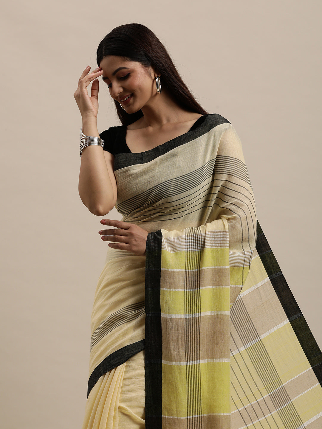 Yellow Cream Colour Block Cotton Saree with pompoms