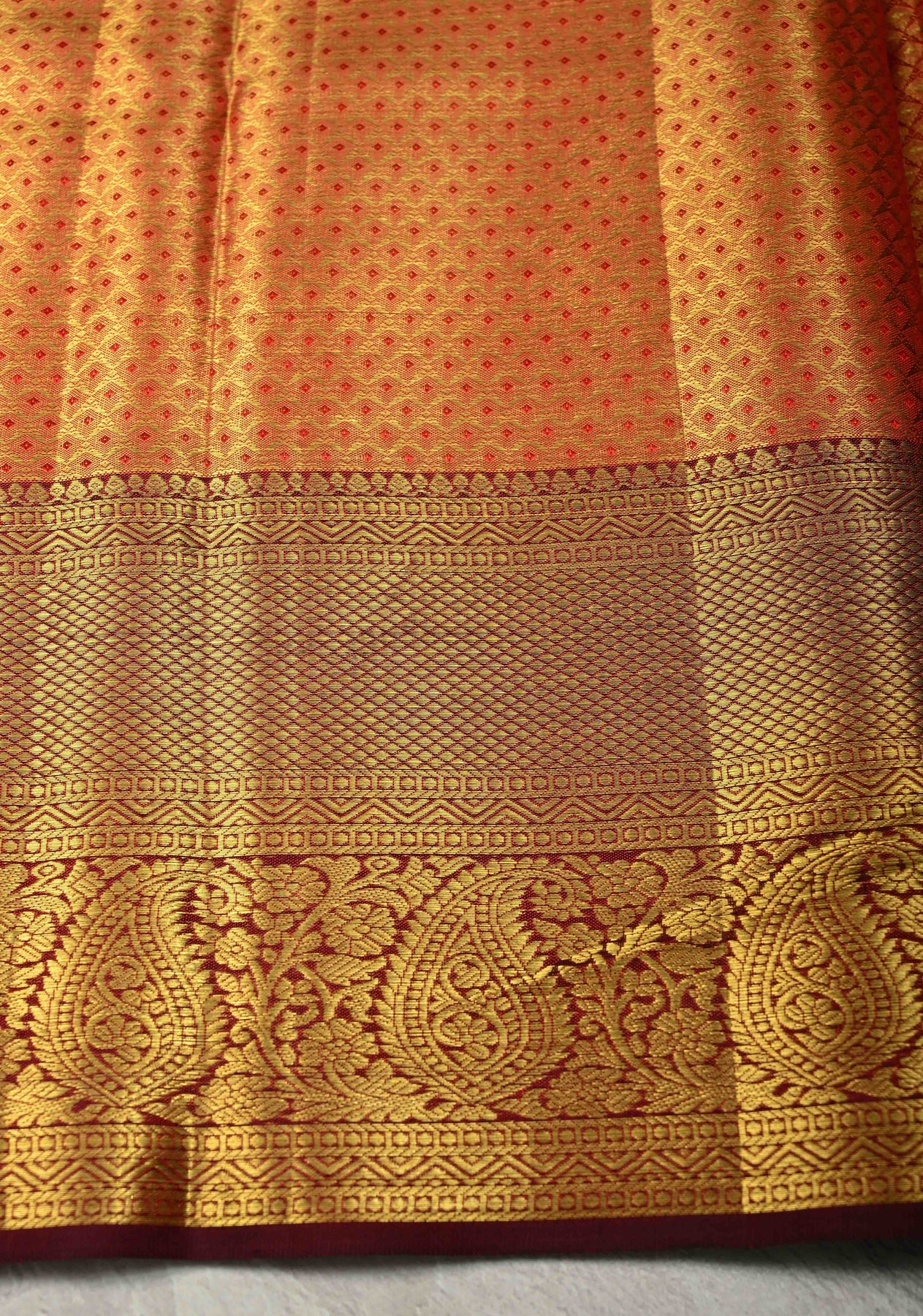 This mustard dual-tone pure Kanjivaram tissue silk saree is a timeless blend of tradition and elegance. Crafted from tissue silk, it features a rich interplay of shimmering hues that enhance its regal appeal. The saree is adorned with intricate meenakari floral brocade jaal woven gracefully across the body, adding depth, color, and artistic finesse. A classic zari border frames the saree beautifully, lending a touch of opulence and heritage charm. Perfect for weddings, festive celebrations, and grand occasions, this exquisite Kanjivaram saree reflects refined craftsmanship and enduring South Indian artistry.
