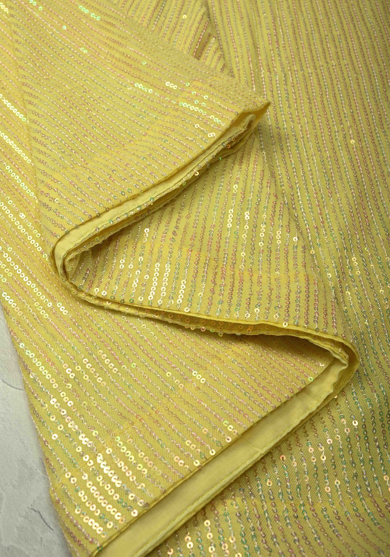 A Sequin on Net Saree in Butter Yellow is a stunning blend of elegance and glamour, perfect for any festive or formal occasion. The delicate butter yellow color exudes warmth and sophistication, while the sheer net fabric creates a soft, ethereal effect. What truly sets this saree apart is the intricate sequin detailing scattered across the fabric, which catches the light beautifully, adding a touch of sparkle and refinement. The combination of the delicate net fabric with the shimmering sequins gives the saree a contemporary yet timeless appeal. Whether draped in a traditional style or with a modern twist, this saree is an elegant choice that radiates charm and is sure to turn heads at any event. Paired with a matching or contrasting blouse, it offers versatility and can be accessorized to suit any personal style.