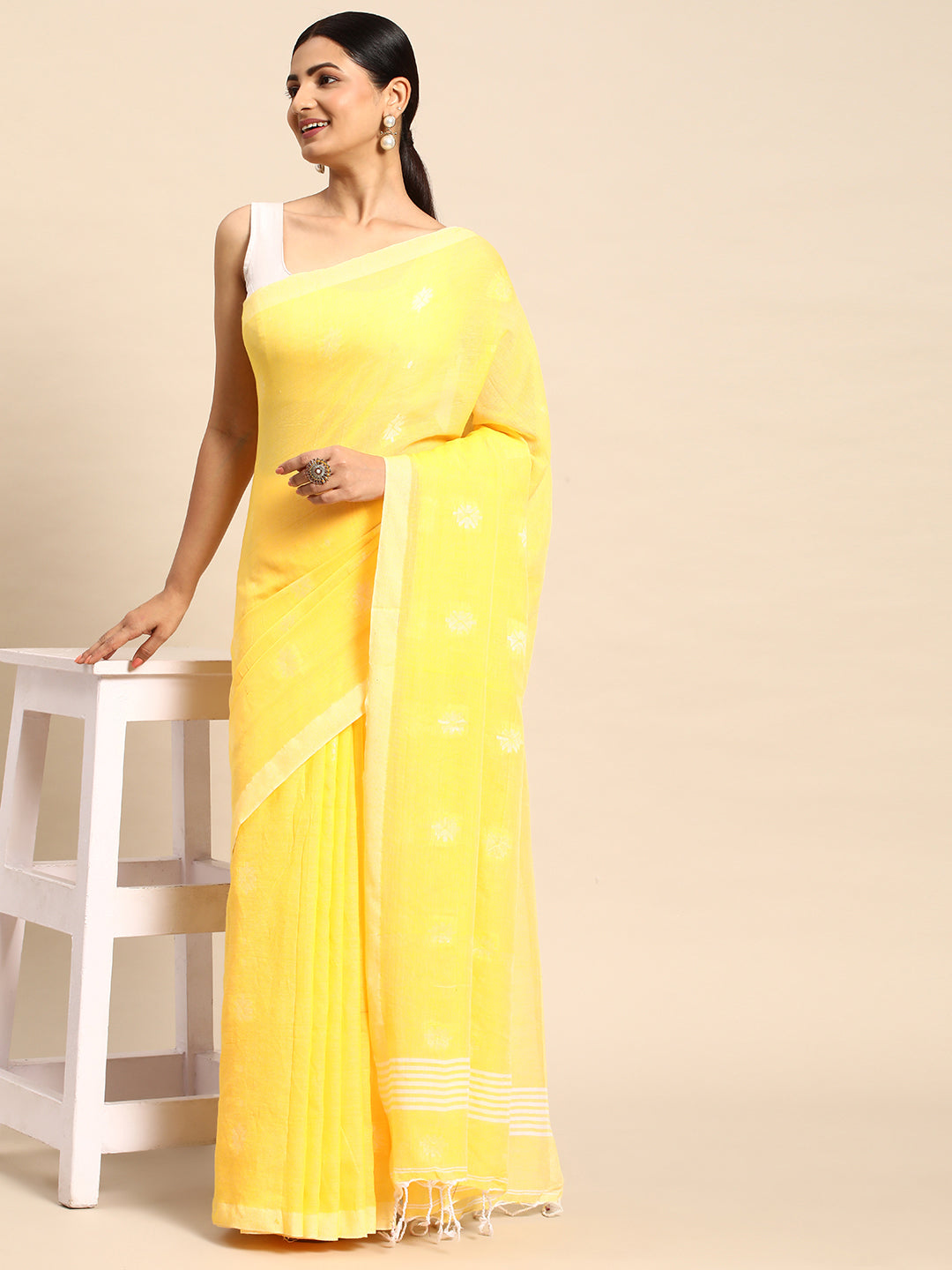 Elevate your ethnic wardrobe with this Yellow White Buti Cotton Saree with Minimal Border. Made from soft, breathable handloom cotton, it features a pristine white base adorned with delicate yellow buti motifs. The minimal border enhances the saree’s understated elegance, making it ideal for daily wear, casual outings, office events, and traditional celebrations.