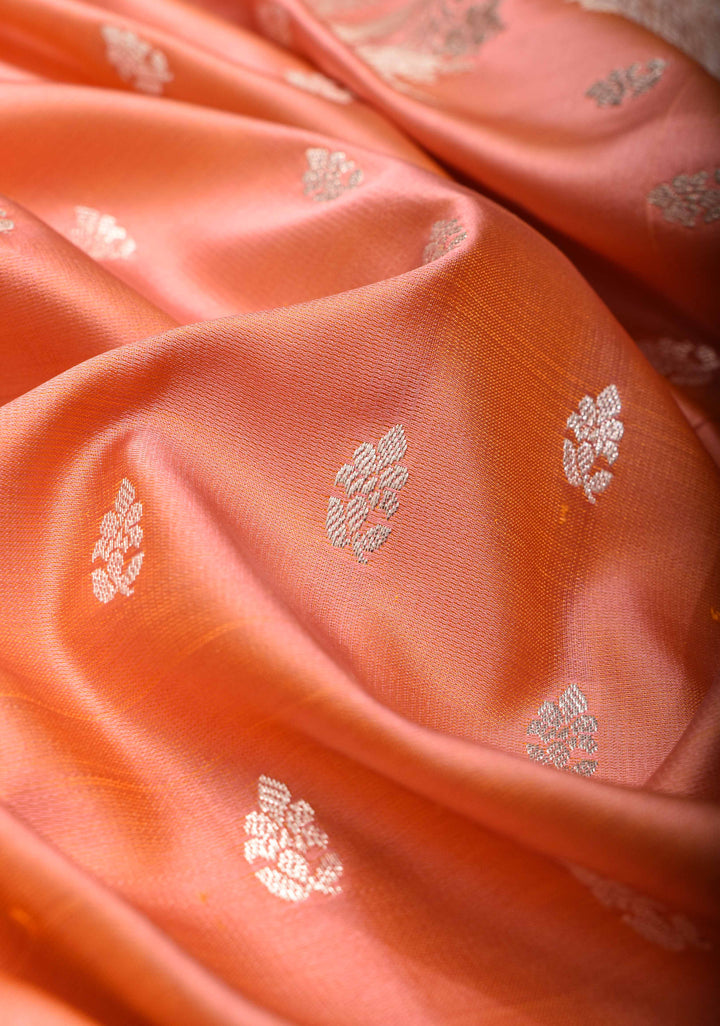 The Peach Mashru Silk Saree with Floral Butis and Zari Border is a perfect blend of elegance and traditional craftsmanship. Made from luxurious Mashru Silk, the saree features a smooth, lustrous texture that drapes beautifully, offering both comfort and style. The soft peach color adds a warm, refreshing touch, making it ideal for weddings, festivals, and other celebratory occasions.