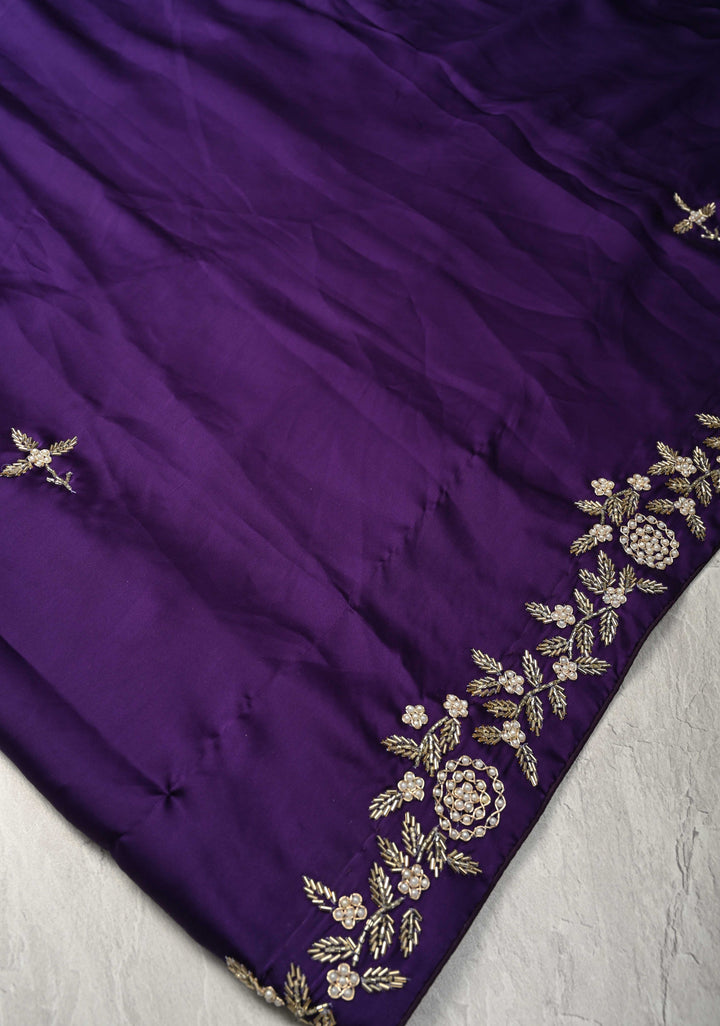 The Purple Georgette Saree with cutdana, moti, and zardosi embellishments is a captivating blend of tradition and elegance. Crafted from lightweight georgette fabric, it drapes effortlessly, offering a flattering and fluid silhouette. The deep ink blue shade brings a rich and regal feel, making it a perfect choice for evening events, festive occasions, or wedding functions. Beautifully adorned with intricate cutdana, delicate moti (pearl), and detailed zardosi work, the embellishments add a luxurious sparkle and artistic flair to the overall look. Elegant yet striking, this saree is ideal for those who appreciate timeless craftsmanship with a touch of contemporary sophistication.