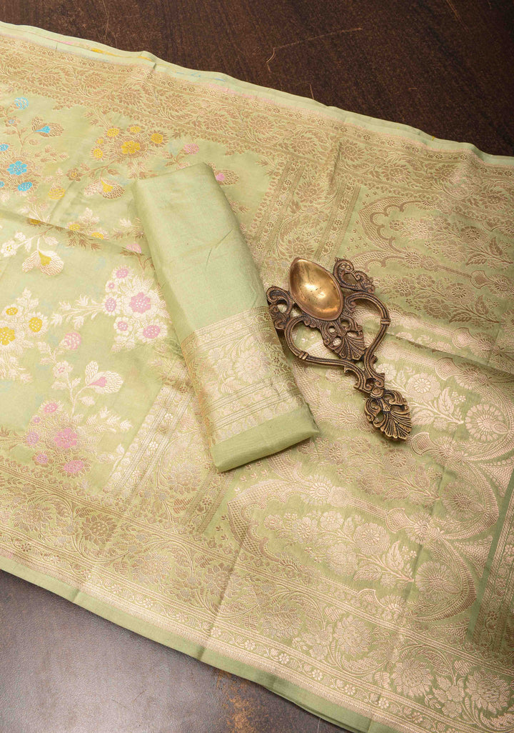 This Pale Green Pure Banarasi Katan Silk Saree is a stunning example of traditional Indian craftsmanship. Woven with the finest quality Katan silk, the saree boasts a delicate pale green hue, exuding a soft and elegant charm. The fabric is adorned with a beautifully intricate Meenakari Brocade Jaal, which features vibrant and exquisite patterns of florals and motifs, highlighting the artistry of Banarasi weavers.
