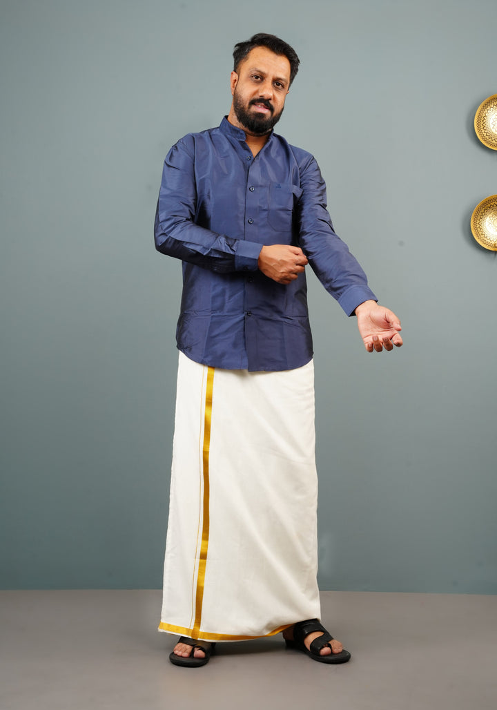 This Navy Blue Color Art Silk Slim Fit Solid Party Shirt comes with a mandarin collar and has Long roll-up sleeves