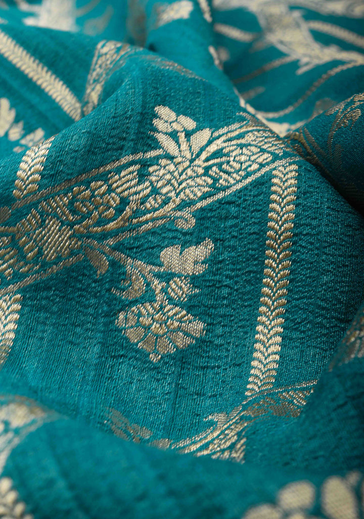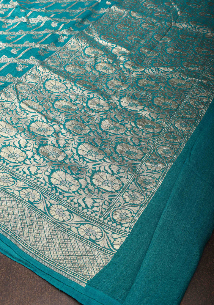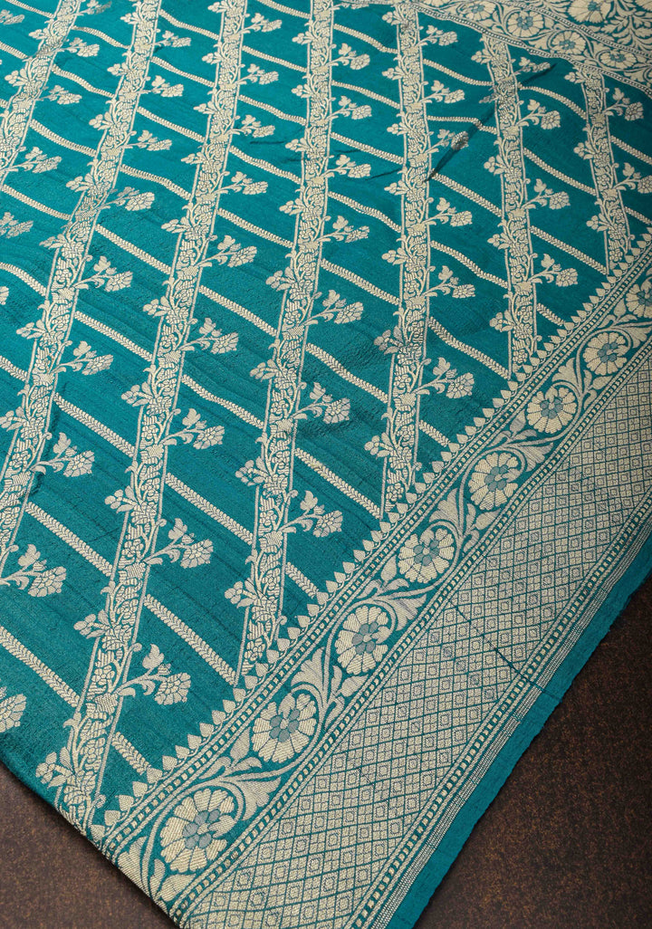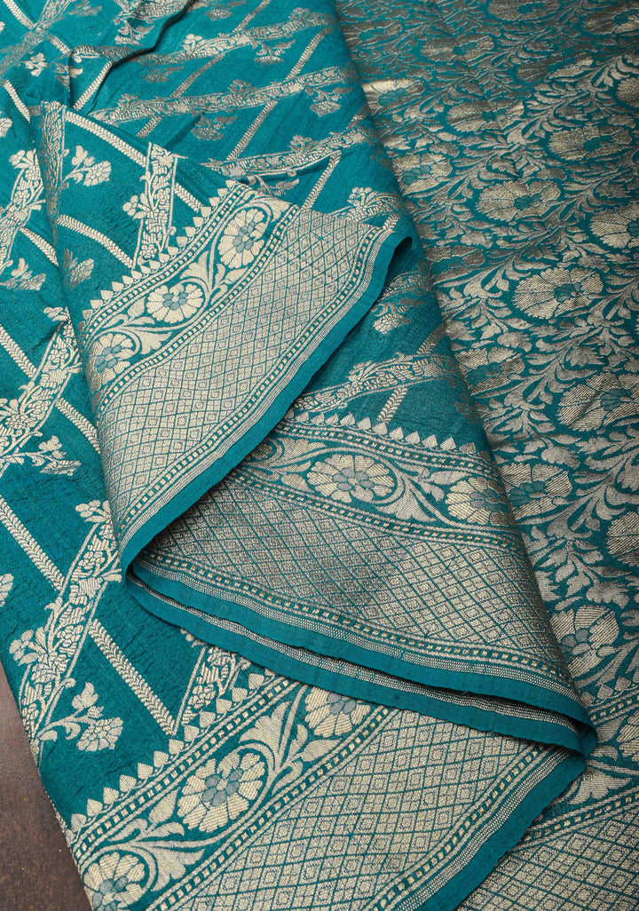The Dark Teal Vertical and Diagonal Stripes Tussar Georgette Silk Saree with Zari Border is a sophisticated blend of contemporary style and traditional craftsmanship. Crafted from premium Tussar georgette silk, this saree features bold vertical and diagonal stripes in dark teal, offering a unique and modern aesthetic. The zari border adds an elegant, shimmering touch, enhancing the saree's luxurious appeal. Perfect for weddings, festivals, or any special occasion, this saree combines comfort with opulence. Its striking design and rich texture make it a perfect choice for those looking for a refined and fashionable look