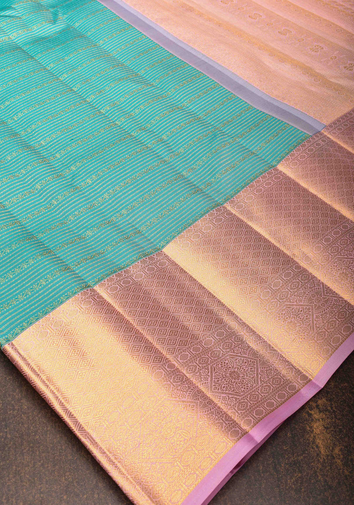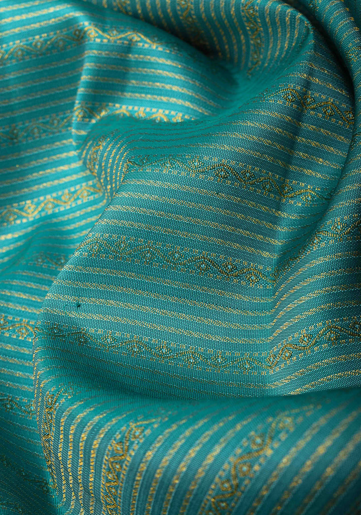 The Dark Cyan Kanjivaram Silk Saree with Zari Horizontal Stripes and Contrast Zari Border is a sophisticated blend of rich tradition and contemporary design. Crafted from luxurious Kanjivaram silk, this saree offers a lustrous finish that drapes beautifully, creating an elegant and flattering silhouette. The deep dark cyan color exudes a sense of regal charm, making it perfect for weddings, festivals, and other special occasions.