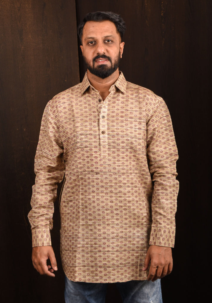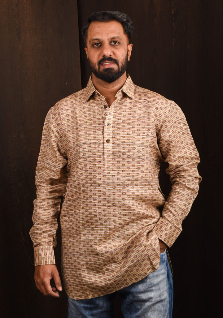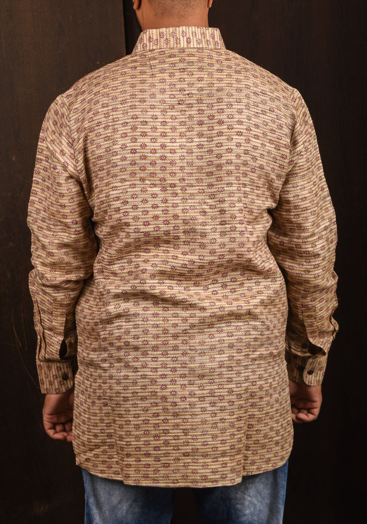 Looking for a unique gifting option for your loved one? This one-of-a-kind shirt is a perfect choice. The highlight of this shirt is the hand-blocked printed geometric patterns which give it a subdued finish. This elegant shirt is made from rich and textured tussar silk interwoven with cotton. This light and comfortable shirt is collared and has full sleeves.