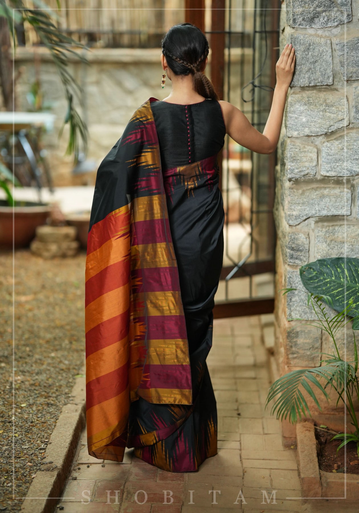 Temple borders in two colors work their charm on this bold and beautiful black saree in art silk.